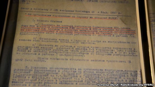 У київському Меморіалі пам’яті жертв Голодоморів відкрили виставку про штучні переселення росіян та білорусів на Схід України після Голодомору 1932–33 років. Експозицію складають засекречені партійні документи, у яких детально змальовано цей процес. Співробітники музею переконані: інформація про насильницьку асимілятивну політику Радянського Союзу може частково пояснити сепаратизм на Сході сучасної України.