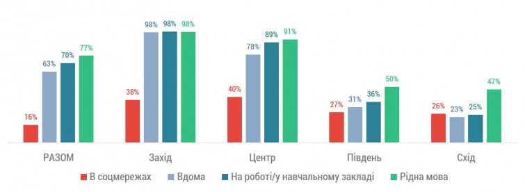 На роботі або навчанні українську використовує 57% громадян. Натомість частка постів українською не перевищує 20%.
