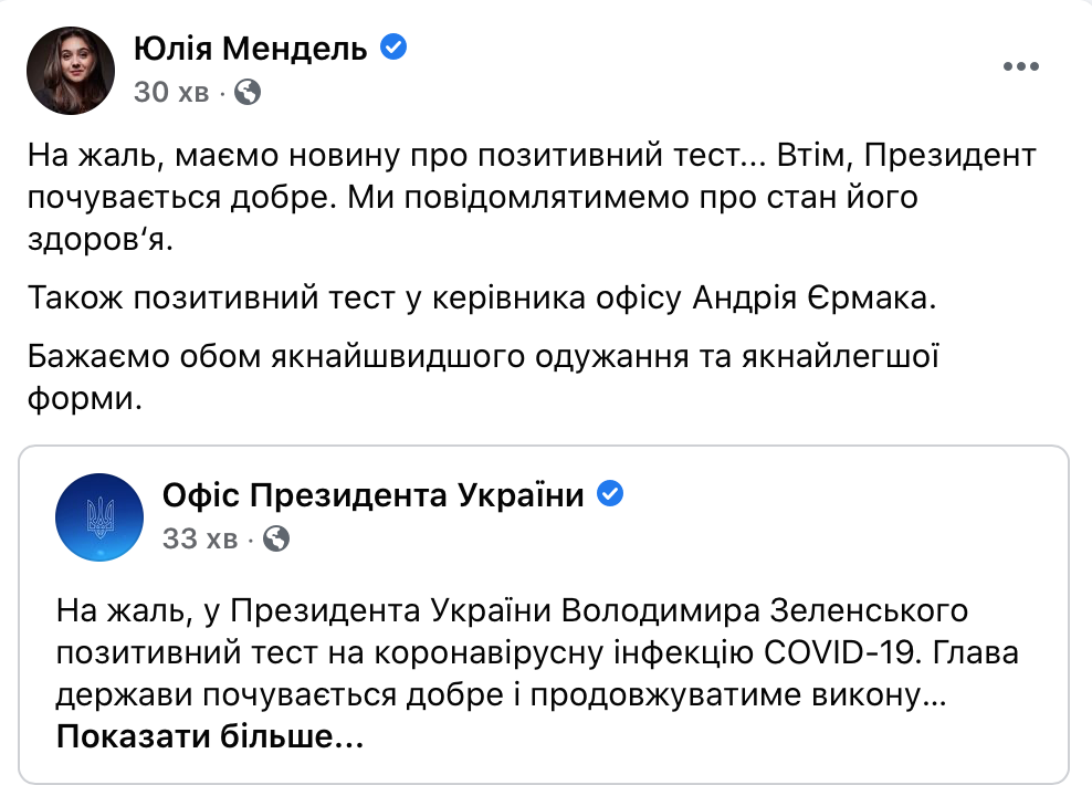 Саме з такими словами прессекретарка Зеленського Юлія Мендель повідомила про COVID-19 у президента.