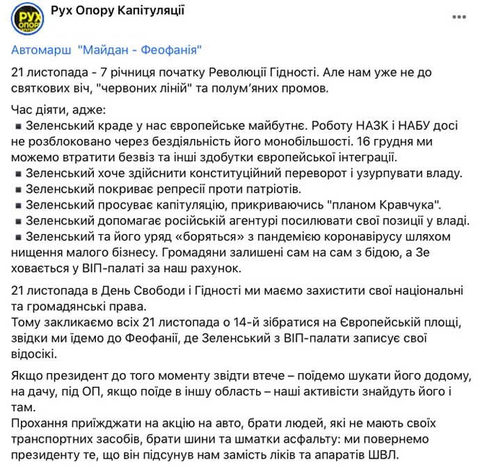 «21 ноября — 7 годовщина начала революции Достоинства. Но нам уже не до праздничных собраний, „красных линий“ и пламенных речей… В День Свободы и Достоинства мы должны защитить свои национальные и гражданские права. Поэтому призываем всех 21 ноября в 14-й собраться на Европейской площади, откуда мы поедем в Феофанию, где Зеленский с ВИП-палаты записывает свои видосики», — сказано в анонсе акции.