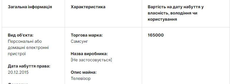 А еще академик Национальной академии аграрных наук Украины Мельничук указал в декларации несколько весьма интересных вещей. Среди них, например, телевизор стоимостью 165 000 гривен. Это на момент покупки в 2015 году. Доллар, помнится, тогда был где-то по 20 грн. Восемь тысяч долларов за телевизор! Неплохо, что тут сказать.