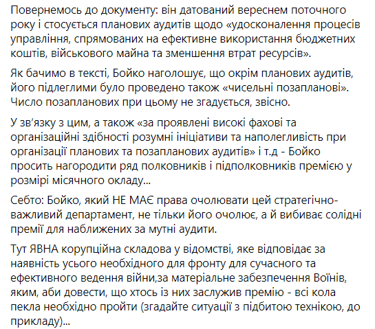 Подчиненные Бойко также провели ряд внеплановых аудитов. За это начальник попросил наградить полковников и подполковников премиями в размере месячного оклада, утверждает блогер.