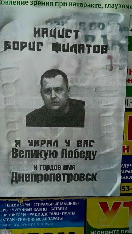 Накануне Дня Победы центр Днепропетровска оказался обклеен листовками с обвинениями в адрес народного депутата, в прошлом – одного из заместителей экс-губернатора области, олигарха Игоря Коломойского Бориса Филатова.