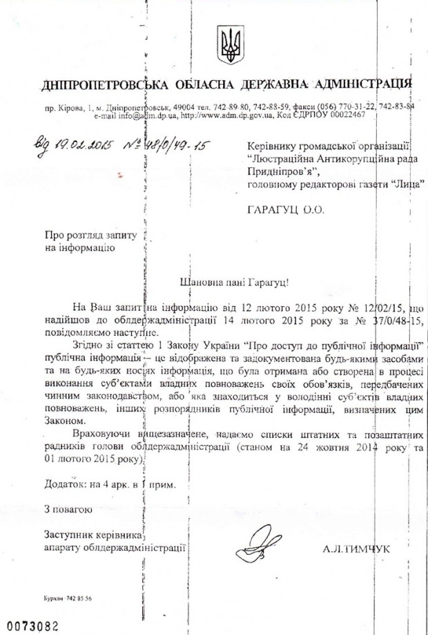 При губернаторе Резниченко редакция газеты «Лица» добилась ответа на запрос о советниках экс-губернатора. Две попытки получить информацию, когда Игорь Коломойский возглавлял ОГА, успехом не увенчались.