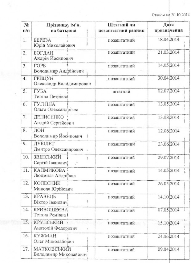 | 1 | БЕРЕЗА Юрій Миколайович | позаштатний | 18.04.2014 |