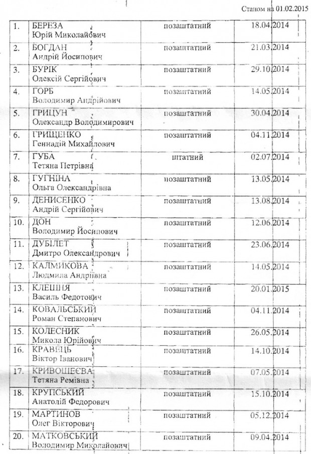 | 1 | БЕРЕЗА Юрій Миколайович | внештатный | 18.04.2014 |