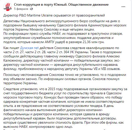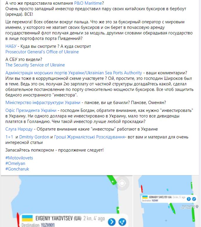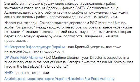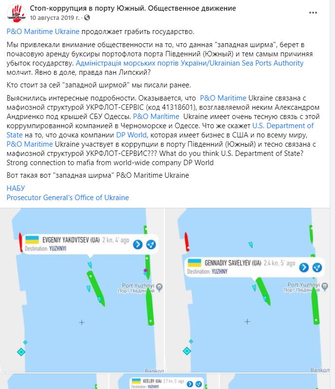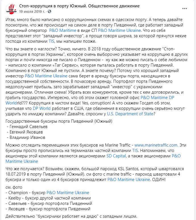 Далее – интереснее. В августе прошлого года на той же странице «Стоп-коррупция в порту Южный. Общественное движение» снова появилась информация о том, что общественности стараются донести нечно важное. Речь идет о том, что компания P&O Maritime Украина продолжает причинять убыток нашей стране.