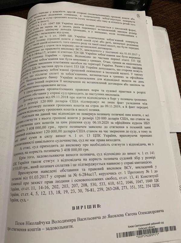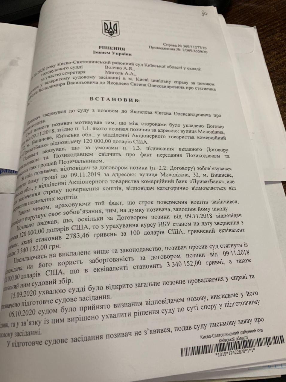 У листопаді 2020 р. Деснянське управління поліції проводило розслідування за фактом заволодіння Яковлевим Є.О чужим майном, а саме – 120 тис. дол або понад 3,3 млн грн. Саме стільки Яковлев позичив у громадянина Н. ще у 2018 р. на рік і досі не віддав. Підтвердженням невиконання Яковлевим своїх фінансових зобов’язань є договір позики, на підставі якого громадянин Н. і звернувся до суду з відповідним позовом. Суд став на бік позивача і ухвалив рішення про стягнення з Яковлева суми боргу.