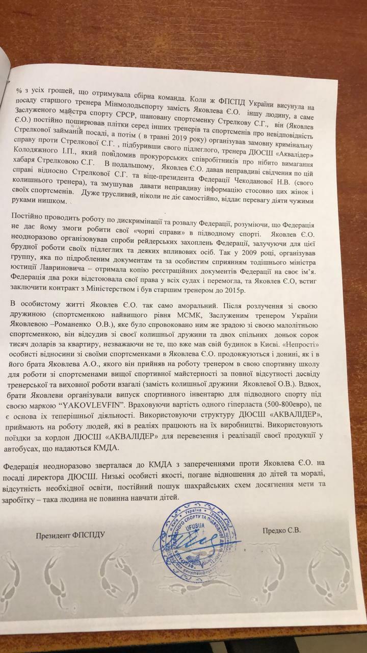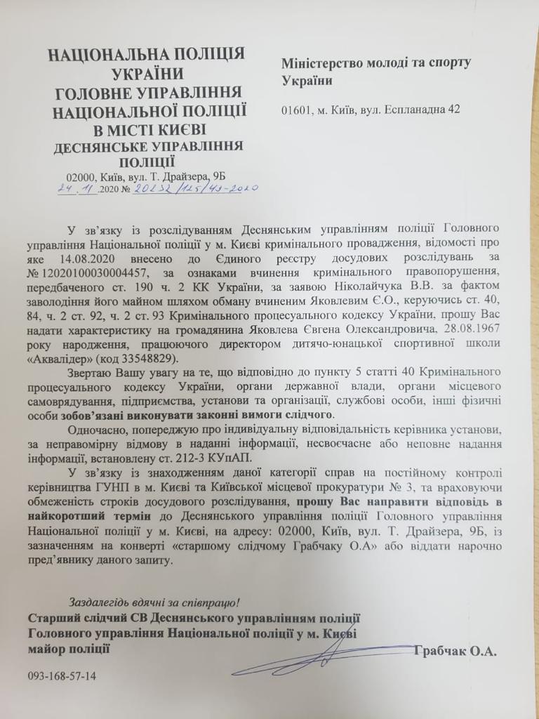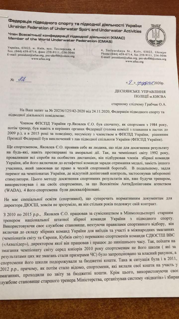 Правоохоронці, розслідуючи цю справу, звернулися до Міністерства молоді та спорту, Департаменту молоді та спорту Виконавчого органу КМДА та до Федерації підводного спорту та підводної діяльності України, щоб ті надали характеристику на Яковлева. З відповіді федерації ми й дізналися про ще більш пікантні «заслуги» цього діяча.
