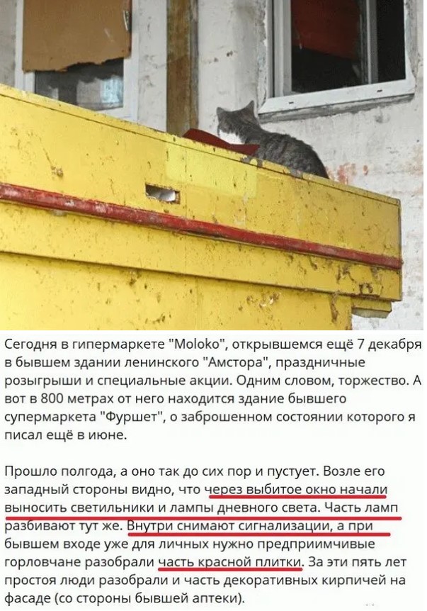 «Часть ламп разбивают тут же. Внутри снимают сигнализации, а при бывшем входе уже для личных нужд предприимчивые горловчане разобрали часть красной плитки. За эти пять лет простоя люди разобрали и часть декоративных кирпичей на фасаде (со стороны бывшей аптеки)… И это не кто-то из дальних стран, а жители прилегающих районов. Кроме того, можно видеть, как внутрь супермаркета до сих пор проникают дети, которые бьют здесь окна…».