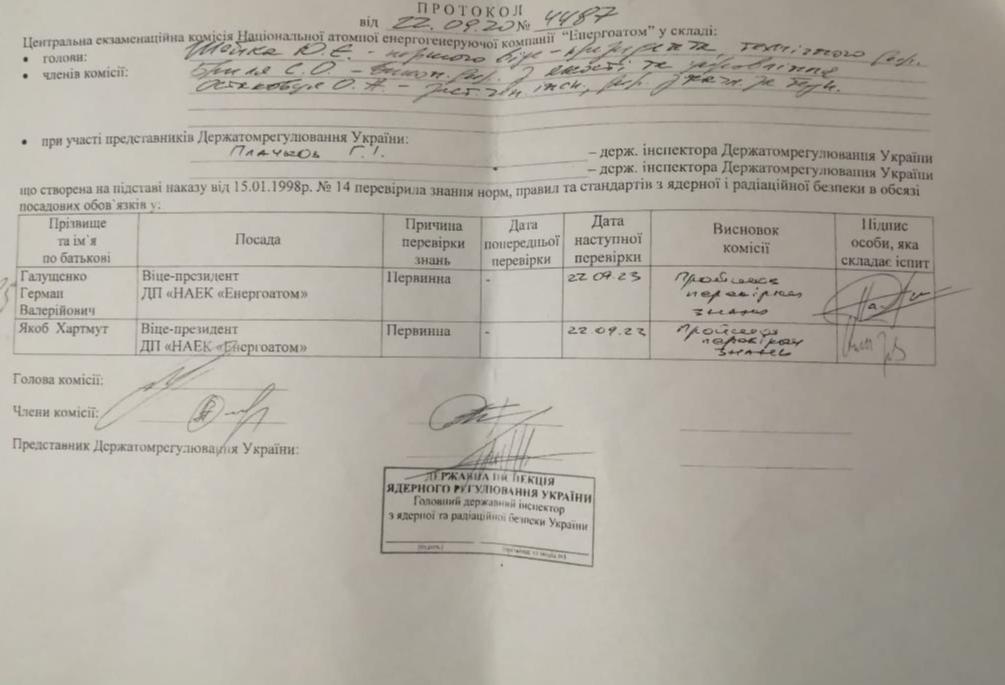 Цим документом центральна екзаменаційна комісія Національної атомної енергогенеруючої компанії «Енергоатом» прийняла іспити у Германа Галущенка і Якоба Хартмута на знання норм і стандартів з ядерної безпеки.