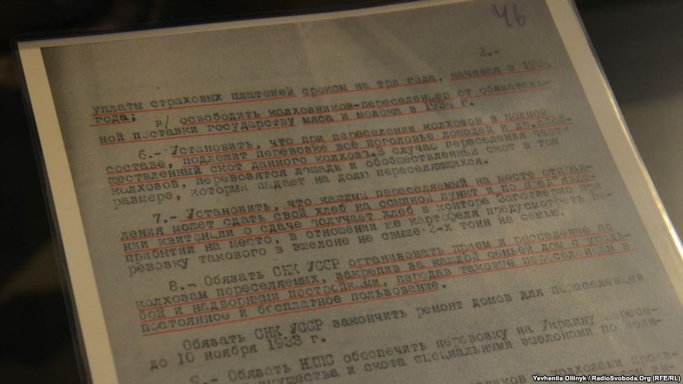В киевском Мемориале памяти жертв Голодомора открыли выставку об искусственном переселении русских и беларусов на восток Украины после Голодомора 1932-33 годов. Экспозицию составляют засекречены партийные документы, в которых подробно описан этот процесс. Сотрудники музея уверены: информация о политике насильственной ассимиляции Советского Союза может частично объяснить сепаратизм на Востоке современной Украины.