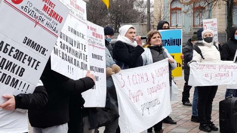 В Киеве медицинские работники вышли на протест под здание Верховной Рады. Участники акции протестуют против сокращения расходов на медицину в государственном бюджете на 2021 год.