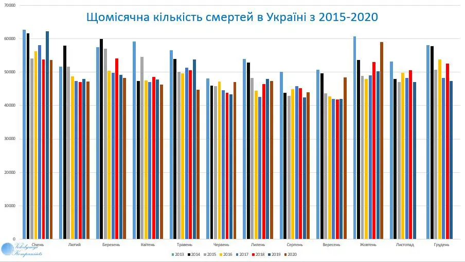 По его словам, в октябре был зафиксирован рекордный прирост смертей в стране – 59,1 тыс. Этот показатель почти равен данным за 2013 год, когда умерло более 60 тыс. украинцев.