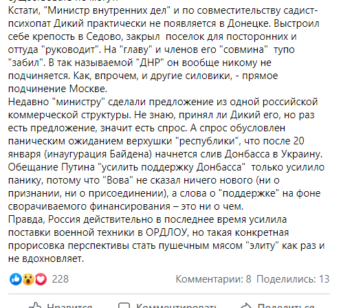 «Выстроил себе крепость в Седово, закрыл поселок для посторонних и оттуда „руководит“. На „главу“ и членов его „совмина“ тупо „забил“. В так называемой „ДНР“ он вообще никому не подчиняется. Как, впрочем, и другие силовики, — прямое подчинение Москве. Недавно „министру“ сделали предложение из одной российской коммерческой структуры. Не знаю, принял ли Дикий его, но раз есть предложение, значит есть спрос».