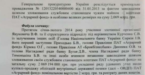 В феврале 2014 года ОАО «Аграрный фонд» поместил на счета Брокбизнесбанка Сергея Курченко указанную сумму. Через несколько недель в банке ввели временную администрацию, то есть все его операции контролировал уже Нацбанк. Но это не помешало вывести деньги на счета подставных фирм, после чего они и исчезли в неизвестном направлении. А Борис Приходько, будучи заместителем главы Национального банка Украины, санкционировал всю эту операцию, проигнорировав тот факт, что необходимого для ее проведения разрешения Министерства аграрной политики нет. Операция по выводу денег была проведена блестяще – всего за один банковский день.