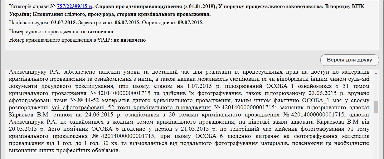 Дошло до того, что суд, что называется, в ручном режиме, стал устанавливать каждому из обвиняемых и защитников сроки ознакомления с делом. Для тех, кто не знаком с уголовным производством, поясним: пока все стороны не ознакомились с материалами уголовного дела, суд не может рассматривать его по сути и вынести решение. Такая норма дает возможность заинтересованным лицам затягивать рассмотрение дела. Оно и верно – куда им спешить – в тюрьму? А так, глядишь, что-то и поменяется.