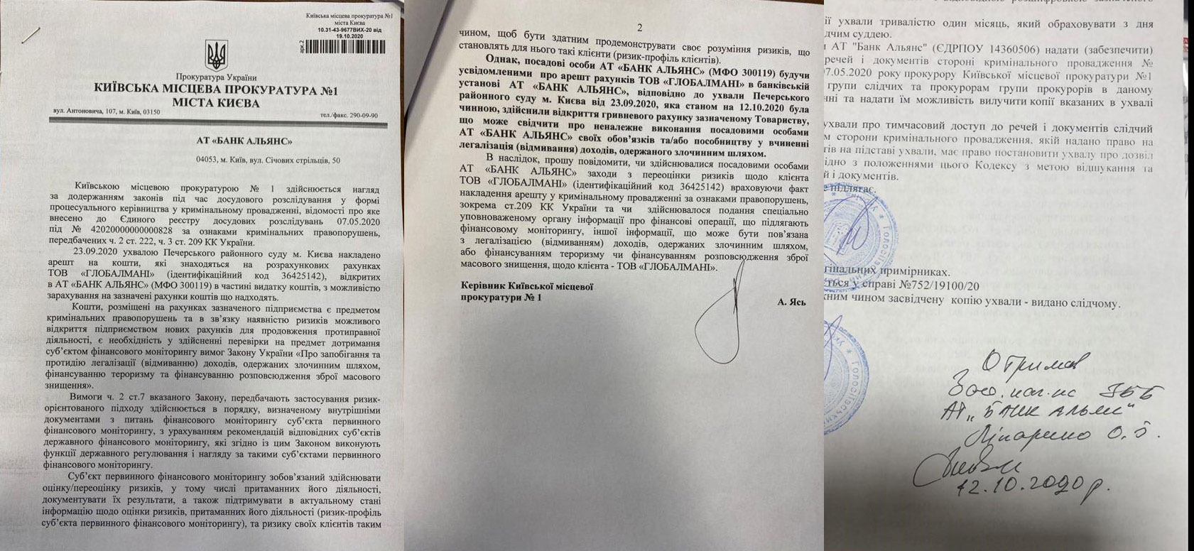 В том же письме должностным лицам банка напоминали, что 23 сентября Печерский районный суд города Киева наложил арест на средства, которые находятся на расчетных счетах ООО “ГлобалМани”, открытых в АО “Банк Альянс”. И обязывал банк раскрыть всю информацию относительно движения денег ГлобалМани по счетам в банке.