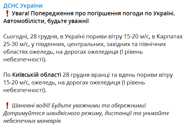 В Киевской области, по данным на Telegram-канале Государственной службы по чрезвычайным ситуациям (ГСЧС), утром и днем порывы ветра будут достигать 15-20 м/с, а также будет гололед и гололедица на дорогах.