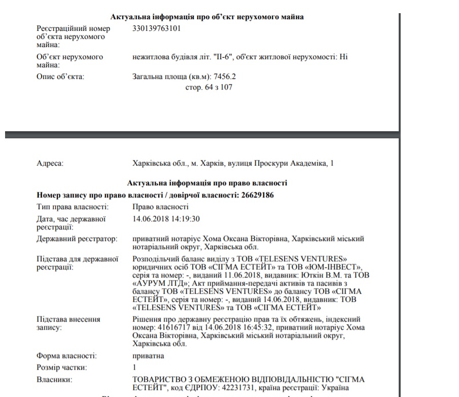 Как стало известно “ОЛИГАРХУ”, в июне 2018 года, в тот же месяц, когда “Укрэксимбанк” подал первый иск к заемщику с требованием погасить долг, Юткин выписал доверенность на выделение из состава поручителя-“TELESENS VENTURES” капитала в виде оставшейся 4/3 части бизнес-центра на два новых юридических лица – ООО “Сигма эксейт” и ООО “ЮМ-инвест”, которое, к слову, с тех пор и до осени 2020 года возглавлял Габриэль Михайлов – новоиспеченный депутат Харьковского горсовета от “Блок Кернеса – Успешный Харьков”.