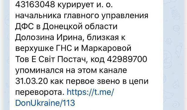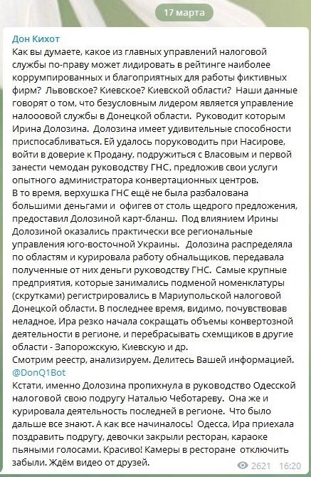 Стоит еще, наверное, поинтересоваться, кто такая Наталия Чеботарева, которую давно и плотно связывают с именем Ирины Долозиной. Оказывается, это ее коллега, экс-глава ГНС в Одесской области, которую задержали за попытку подкупа прокурора. Как утверждает уже упоминаемый телеграмм-канал «Дон Кихот», именно Долозина в свое время проллобировала ее назначение на этот пост. И вместе с ней и рядом других налоговиков занималась НДС и прочими схемами.