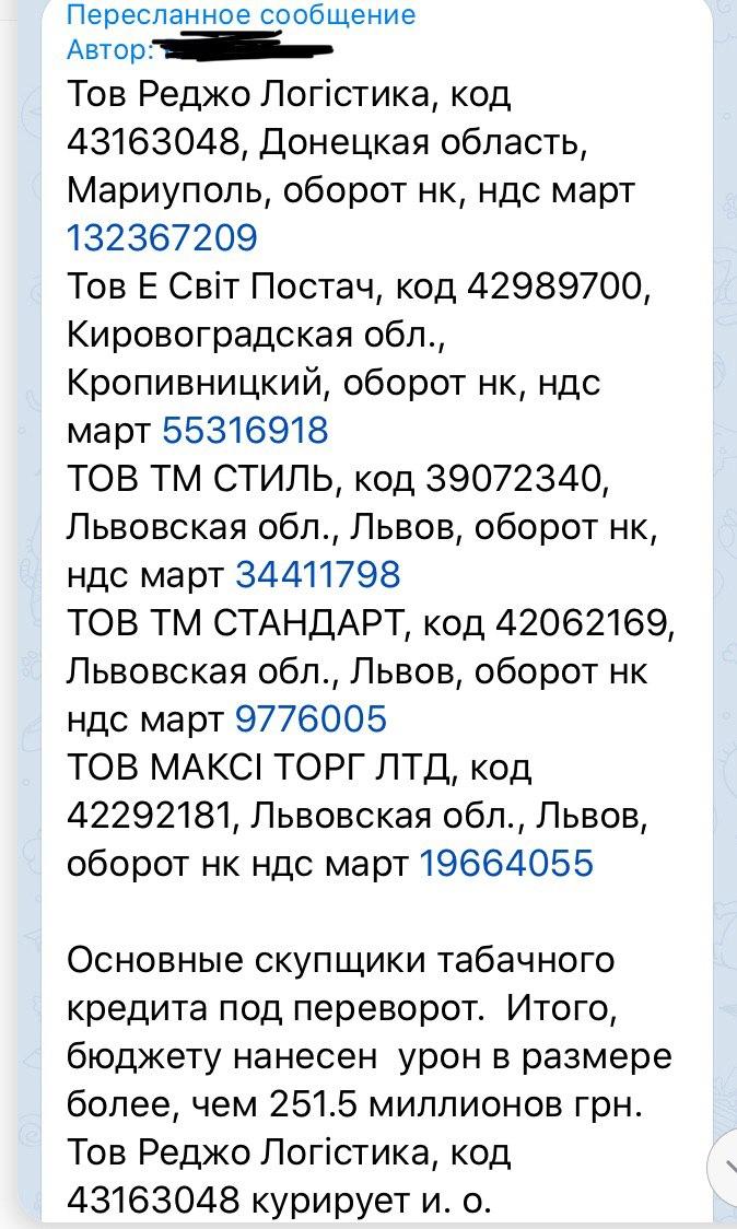 Одной из самых больших и масштабных схем «скрутки» назвали истории с фирмой ООО «Реджо Логистика»: авторы утверждали, что на долю компании пришлось приблизительно 53 миллиона гривен НДС, а курировала фирму, по их словам, Долозина Ирина Леонидовна.