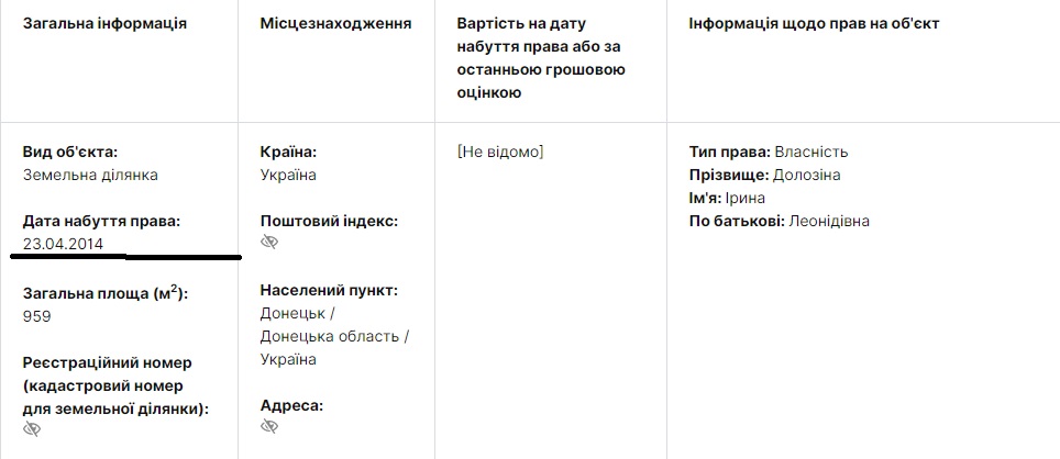Часть имущества находится в оккупированном Донецке. И, что интересно, один из земельных участков в этом городе Долозина приобрела уже тогда, когда украинская власть его не контролировала – 23 апреля 2014 года.