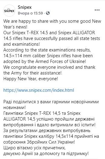 "По результатам государственных испытаний винтовки Snipex калибра 14,5х114 приняты на вооружение Вооруженных Сил Украины! Поздравляем всех причастных, спасибо Армии за помощь и поддержку!" – говорится в сообщении.