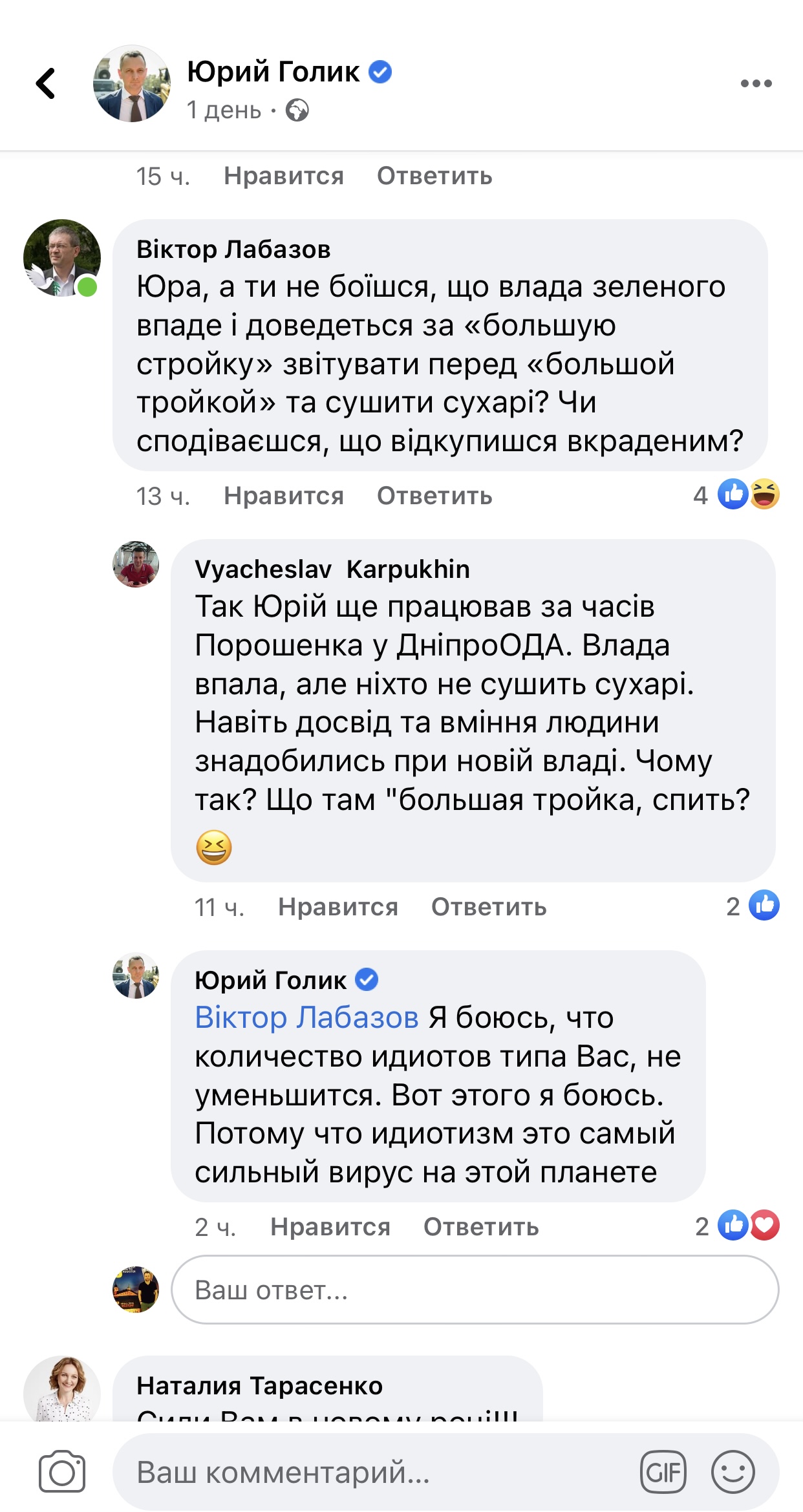 То, что у Голика сильно подгорает, свидетельствует следующий скриншот. Несколько людей наполнили казнокраду о его коррупционной биографии. В ответ Голик и его пиарщики, которые и ведут его страницу, назвали его критиков идиотами, но вскоре комментарии были удалены.