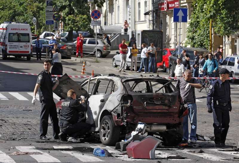 Полицейские возле взорванного автомобиля, в котором находился Павел Шеремет. Киев, 2016 год. Фото: Zuma / TASS