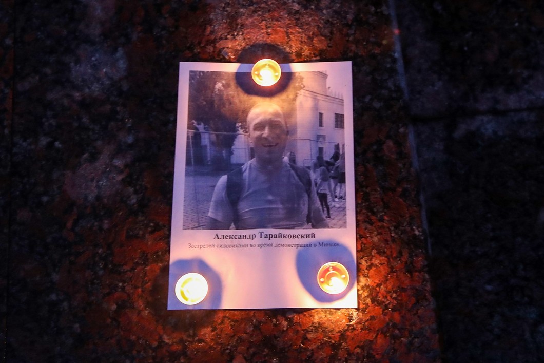 Портрет погибшего во время мирных акций протеста в Минске Александра Тарайковского, 28 августа 2020 года. Фото: Наталия Федосенко / ТАСС