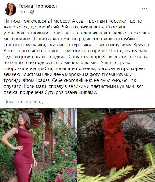 В сети уже пишут, что готовятся к морозам. Так, экс-нардеп Татьяна Черновол, которую подозревают в убийстве на Майдане, написала, что утепляла розы и персики в своем саду советскими шубками и китайскими куртками и похвасталась фото.