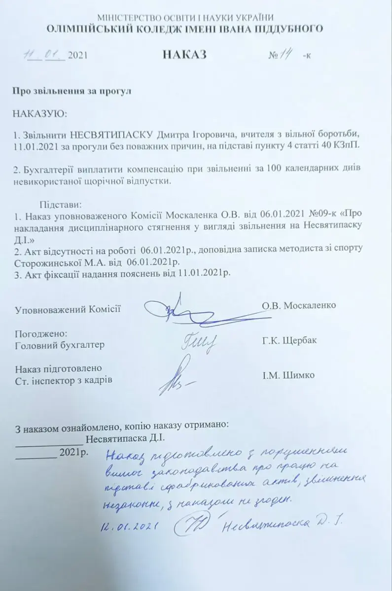 Украинских борцов вольного стиля Богдана Грицая и Дмитрия Несвятипаску, которые работали преподавателями в Олимпийском колледже имени Ивана Поддубного в Киеве, уволили с должностей. Об этом сообщает Несвятипаска на своей странице в Facebook.