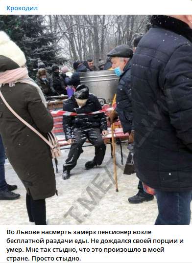 "Во Львове насмерть замёрз пенсионер возле бесплатной раздачи еды. Не дождался своей порции и умер. Мне так стыдно, что это произошло в моей стране. Просто стыдно", - подписали под фото.