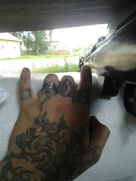 Хотя, и среди российского ополчения попадается не меньший сброд. Например, этот гражданин из Москвы, разукрашенный зековскими «перстнями» и свастикой.