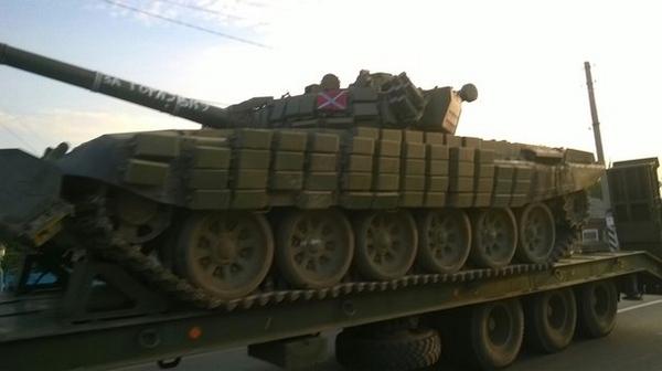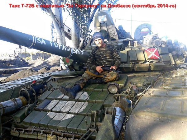 Вот, например, танк Т-72Б едет на тягяче воевать «за ГорлУвку» (правильно — «Горловка»). Скриншот из видео, снятом в Каменск-Шахтинске Ростовской области.