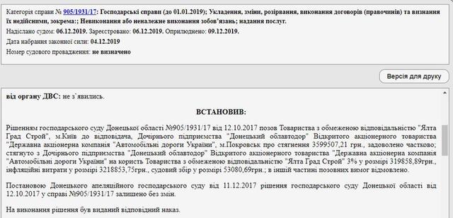 Показательным есть спор филиала Автомобильных дорог ГП «Донецкий облавтодор» с некой компанией с интересным названием «Ялта Град Строй». Если верить официальной информации, фирма специализируется на производстве битума, и была контрагентом государственного предприятия. В суд «Ялта Град Строй» пошла из-за невыплаты средств со стороны «Донецкого облавтодора» общей суммой 3 миллиона 600 тысяч гривен. Суд стал на сторону бизнеса, и присудил в принудительном порядке выплатить средства с учётом инфляции, пени и штрафов.