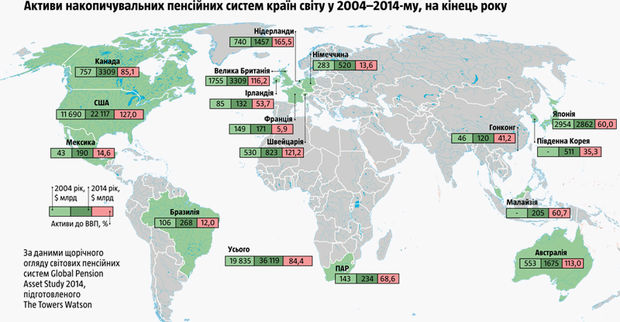 Мировые пенсионные активы накопительных фондов 16 крупнейших рынков мира за последние 10 лет увеличились почти вдвое и на конец 2014-го составили $36,2 трлн. Такая гигантская цифра соответствует 83% совокупного ВВП этих стран. Пальма первенства принадлежит США: на конец 2014 года объем пенсионных активов в Соединенных Штатах составлял $22 трлн. В пятерку лидеров также входят Великобритания ($3,31 трлн), Япония ($2,86 трлн), Австралия ($1,68 трлн), Канада ($1,53 трлн). В пяти странах объемы пенсионных активов превышают валовой внутренний продукт. Так, в Нидерландах соотношение пенсионных активов и ВВП в конце 2014 года оказалось наибольшим и составило 165,5%. В США оно равнялось 127%, в Швейцарии – 121,2%, в Великобритании – 116,2%, в Австралии – 113%.