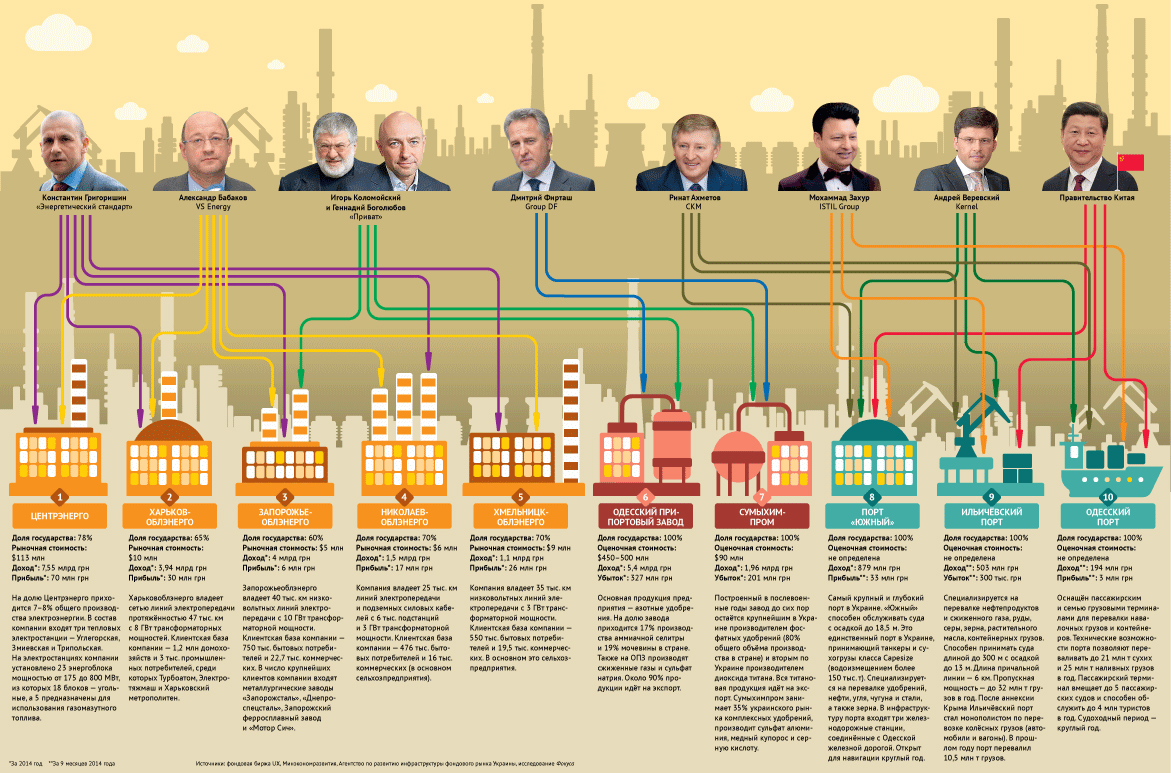К украинским портам сейчас проявляют приватизационный интерес исключительно олигархи. Припортовая инфраструктура — один из самых привлекательных активов страны. По оценке Центра транспортных стратегий, стоимость одних лишь зерновых терминалов украинских портов в 2013 году превышала $3 млрд. "Олигархи давно распределили сферы влияния в портах Украины. Мы вряд ли увидим новые имена среди участников приватизации портов", — считает эксперт в сфере транспорта Александр Кава.