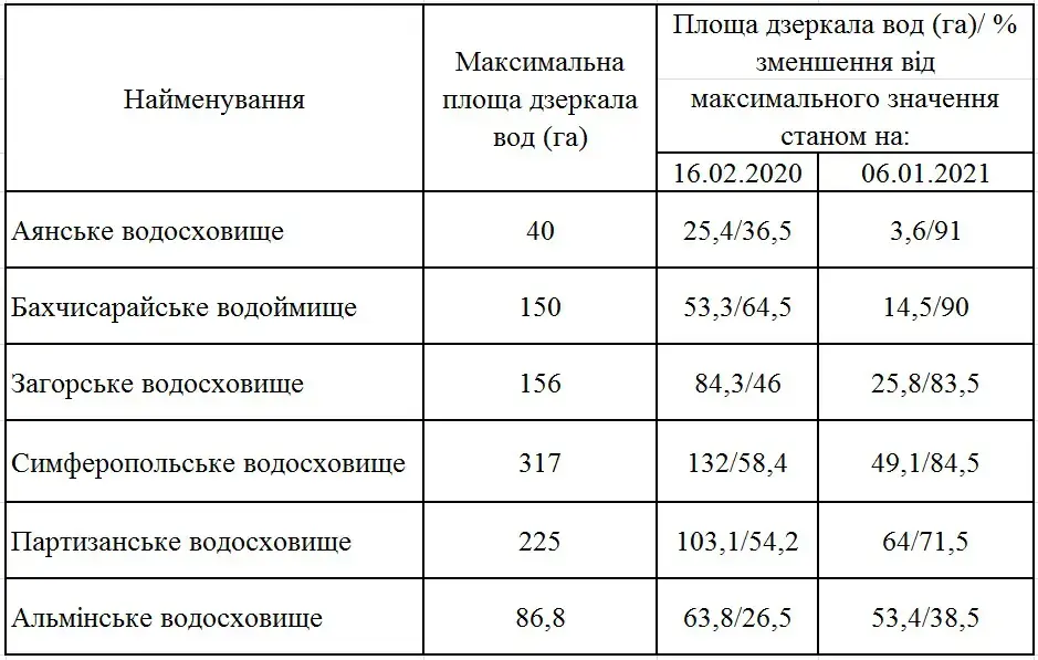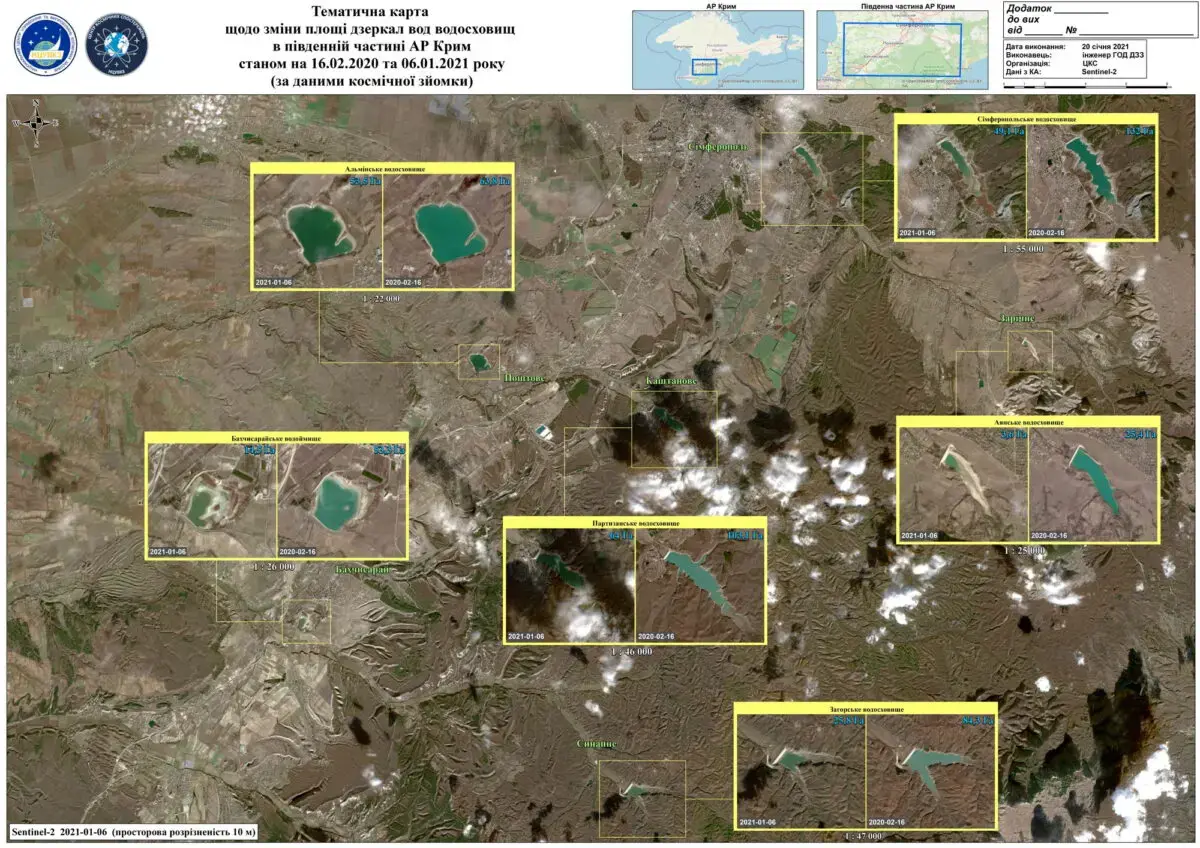 Отмечается, что анализировалось состояние Альминского, Партизанского, Аянского, Загорского и Бахчисарайского водохранилищ. Изучалась ситуация по снимкам, сделанным 16 февраля прошлого года и 6 января этого.