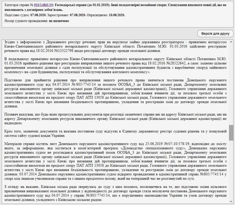 Разбирательства по данной земле на этом не закончились. В октябре 2019 года Киевсовет обратился в Хозяйственный суд Киева с иском к ПАО “АТП 13058” и государственному регистратора – частному нотариусу Киево-Святошинского районного нотариального округа Киевской области Михаилу Потапову (дело №910/14861/19). Столичный горсовет потребовал отменить “судьбоносное” решение о государственной регистрации.