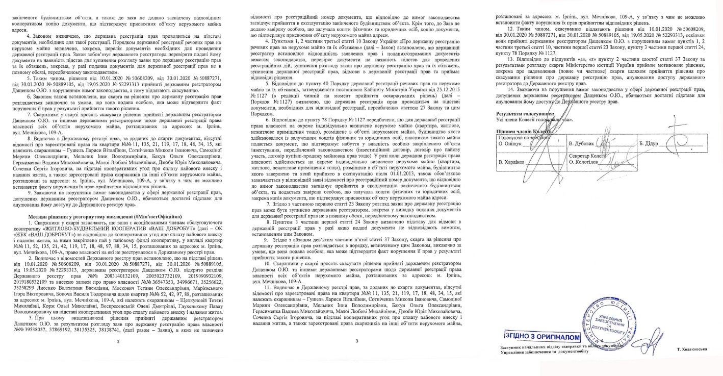 Антирейдерська колегія на чолі з Дмитром Кирилюком скасувала реєстрації, за якими право на актив набуло ТОВ «АБВ нерухомість». Приводом стало те, що ЖК «Ваш добробут» не введений в експлуатацію. А значить, Одрихівський та Дащенко не могли по закону реєструвати в ньому право власності. Обом реєстраторам Мін’юст також анулював доступ до Державного реєстру речових прав.