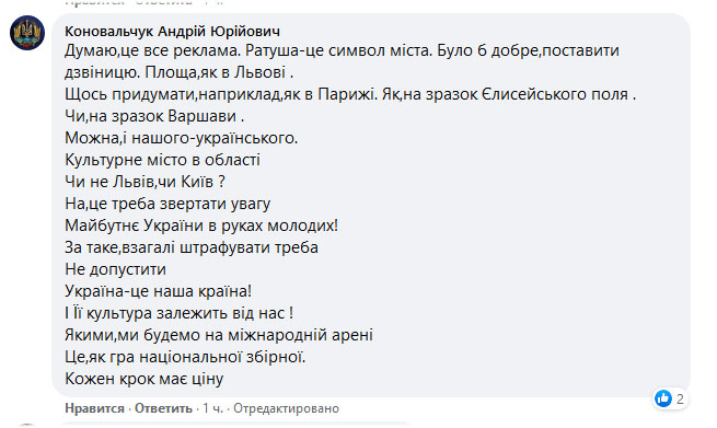 «За такое вообще штрафовать надо, не допустить. Украина — это наша страна и ее культура зависит он нас… Это как игра национальной сборной — каждый шаг имеет цену», — написал Андрей Коновальчук.