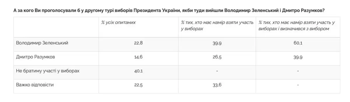 В то же время, 60% из тех, кто примет участие в выборах и определился с кандидатом, проголосовали бы за Зеленского, а 40% — за Разумкова.