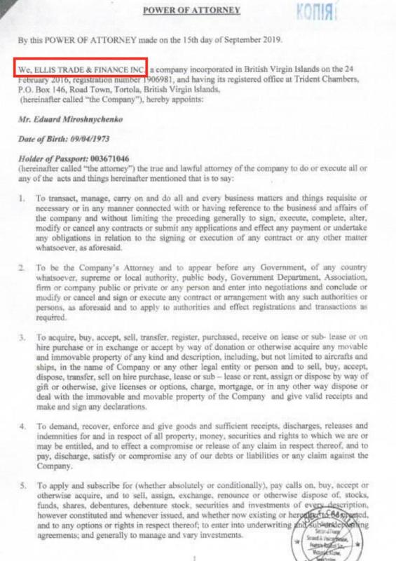 Вышеуказанная доверенность от имени компании «ЕЛЛИС ТРЕЙД ЭНД ФАЙНЕНС» было подписано неуполномоченным лицом - госпожа Джина Сандра Еспарон. Указанное лицо не является и никогда не была директором компании «ЕЛЛИС ТРЕЙД ЭНД ФАЙНЕНС», что подтверждается копией Реестр директоров компании «ЕЛЛИС ТРЕЙД ЭНД ФАЙНЕНС», апостилированы страной Британские Виргинские острова 24.02.2020р.