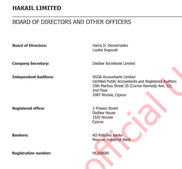 На титульном листе аудиторского отчета за 2017 год Hakail Limited отмечает наличие счета в Московском индустриальном банке в России.