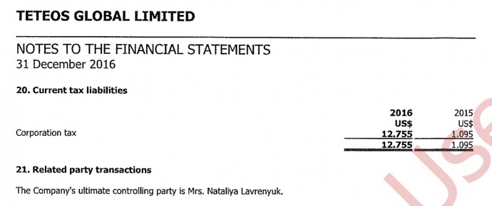 Открываем аудиторский отчет компании Teteos Global Limited и видим, что с 2016 года ее бенефициарным владельцем является Наталья Лавренюк. Это та самая незадекларированная гражданская жена Тараса Козака, которая имеет квартиру на 600 квадратных метров ценою 13 млн долларов и в пешей доступности от Кремля.