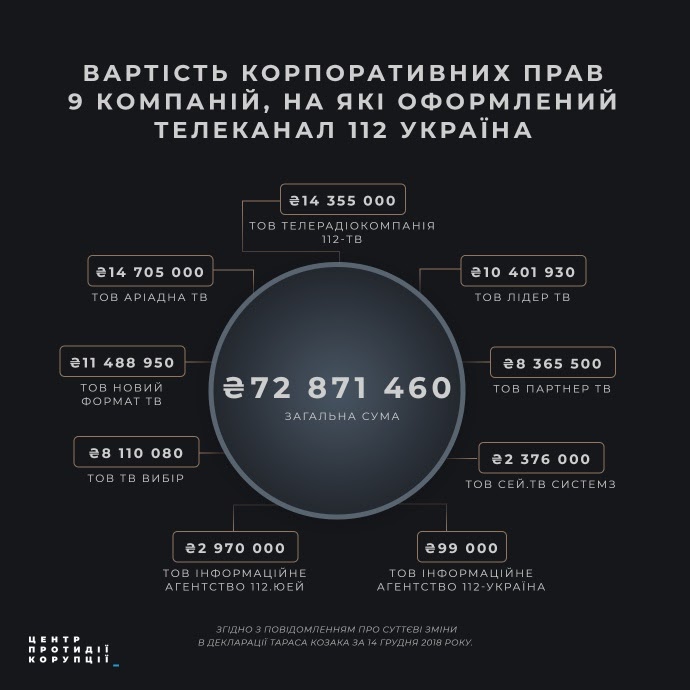 Общая сумма стоимости корпоративных прав на купленные два телеканала составила 114 млн гривен, однако согласно раздела декларации "расходы и сделки" Тарас Козак по факту заплатил за них только 103 миллиона.