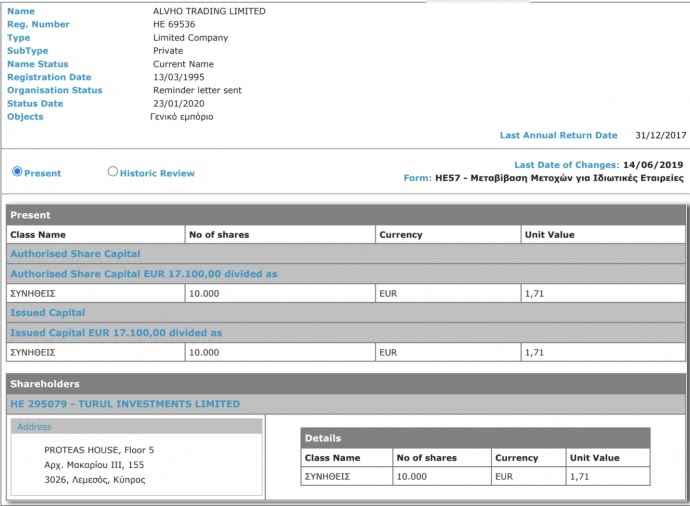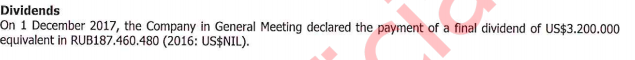 1 декабря 2017 года Hakail Limited декларирует решение выплатить 3,2 млн долларов дивидендов своему единственному акционеру компании Turul Investments Limited. Сумма отмечается ... в российских рублях.