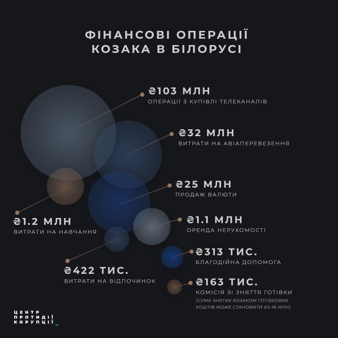 Расследование показало, что телеканалы 112 и NewsOne обошлись Тарасу Козаку в сумму 103 млн грн, которые он платил швейцарским фирмам в 2018-2019 годах через Беларусь. Основные сбережения на сумму 8 млн евро Тарас Козак держит в Беларуси, в частности в Абсолютбанк белорусского олигарха Николая Воробья, который в 2019 году стал совладельцем 1,1 тыс километров нефтепровода в Украине.